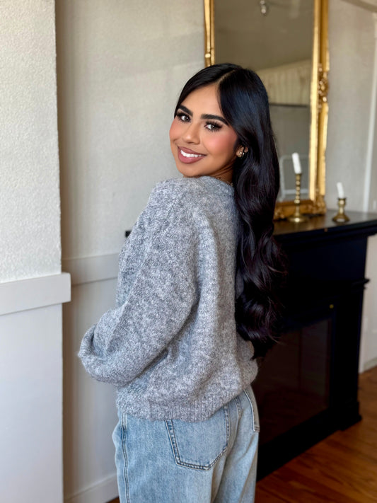 like her gray cardigan