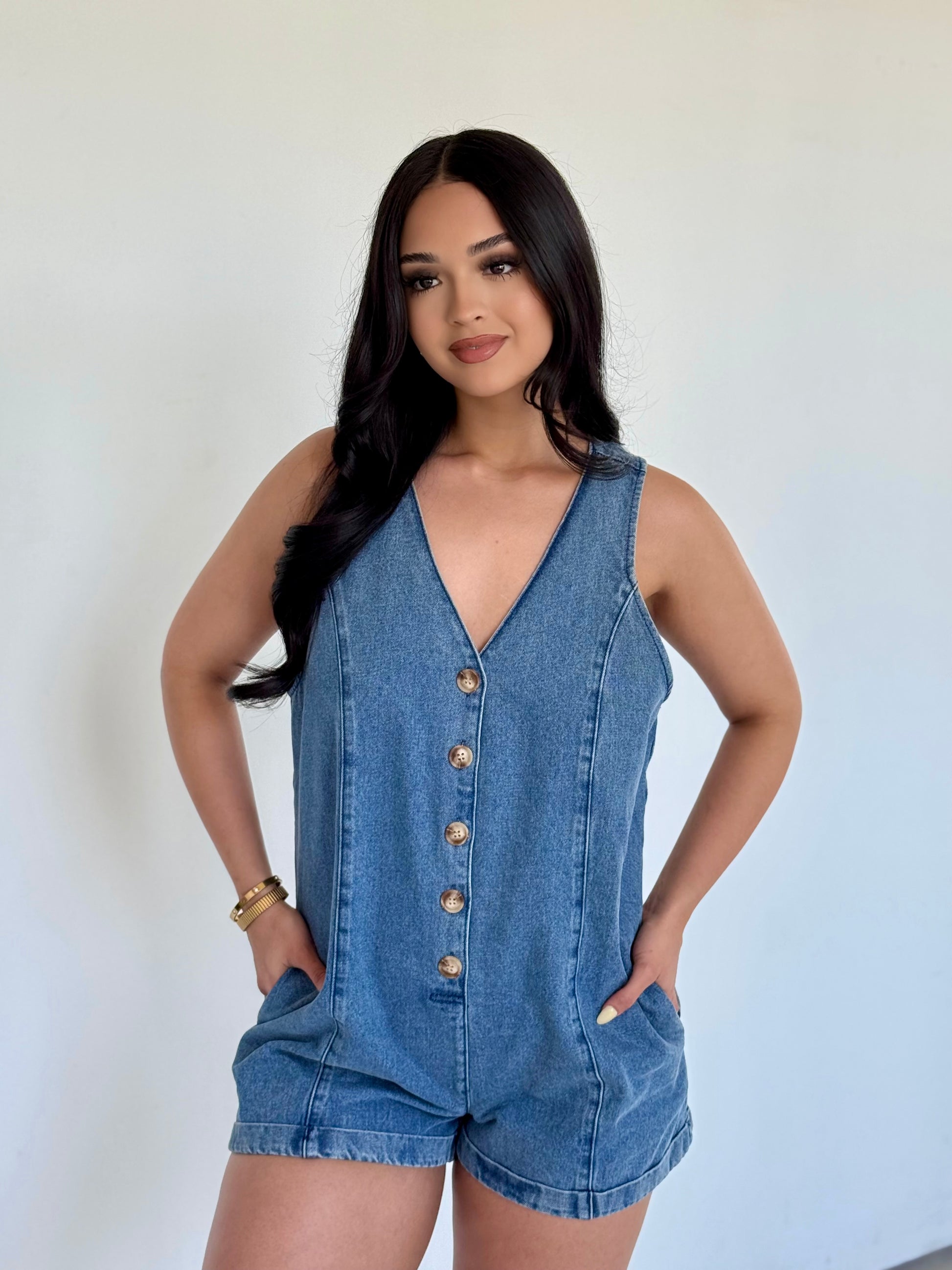 Effortlessly chic and perfect for any season, this denim romper is a closet staple you’ll keep reaching for. Designed with a flattering V-neckline, functional front button details, and a relaxed yet tailored silhouette, it’s the ideal mix of casual and stylish. The sleeveless cut makes it easy to layer — throw it on with a tee underneath for a laid-back vibe or dress it up with bold accessories and heels. Soft, high-quality denim gives it a structured feel without sacrificing comfort, making it perfect for brunch dates, weekend outings, or summer festivals