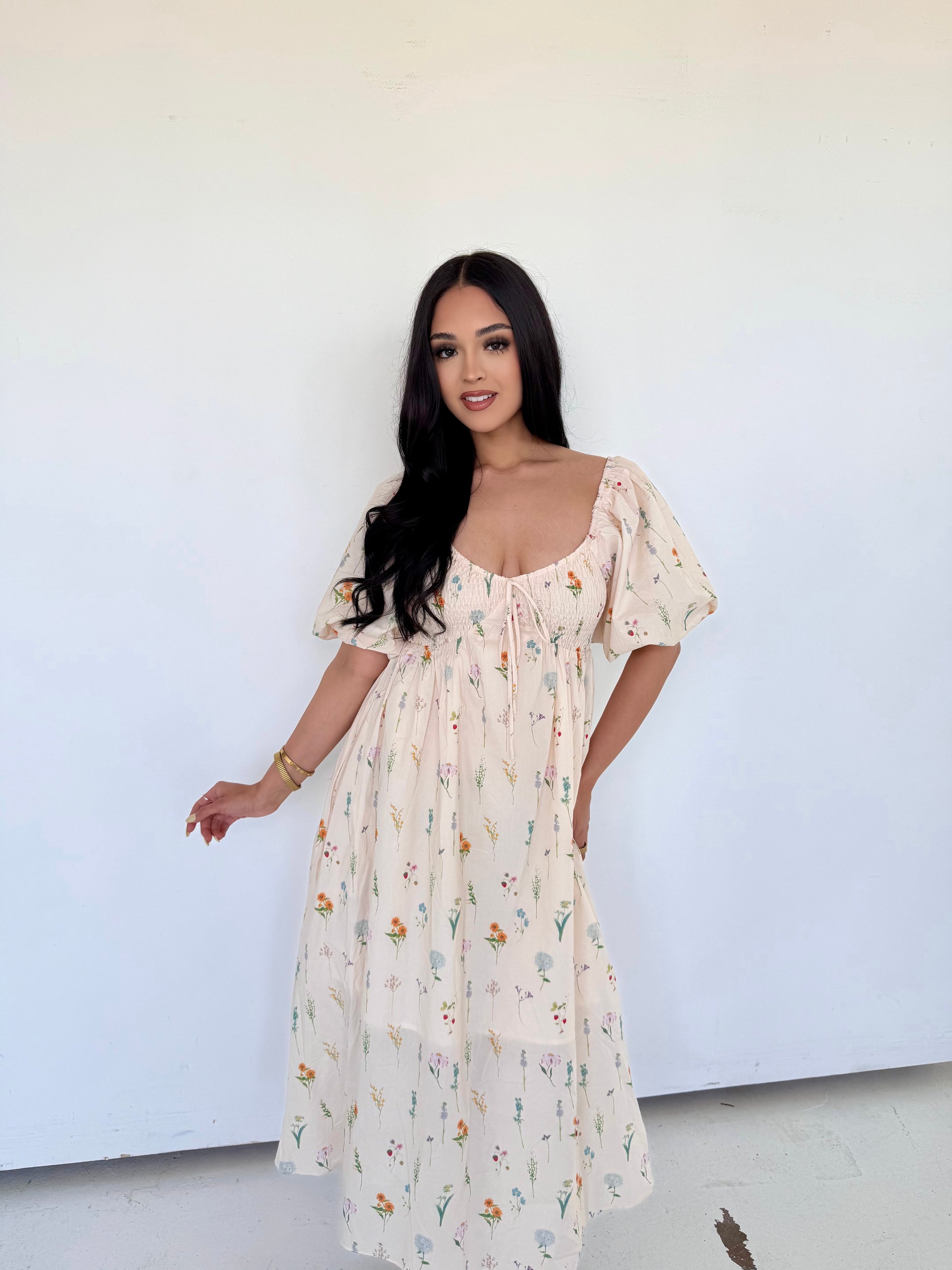 Feminine, romantic, and effortlessly timeless — our Floral Puff Dress is a dreamy piece that belongs in every wardrobe. Designed with soft, lightweight fabric and a delicate floral print, it features charming puff sleeves, a flattering smocked bodice, and a flowy midi-length skirt that moves beautifully with every step. The adjustable tie-front detail adds a sweet, vintage-inspired touch while ensuring the perfect fit. Perfect for brunch dates, picnics, or special occasions, this dress captures the essence of easy elegance and everyday charm.
