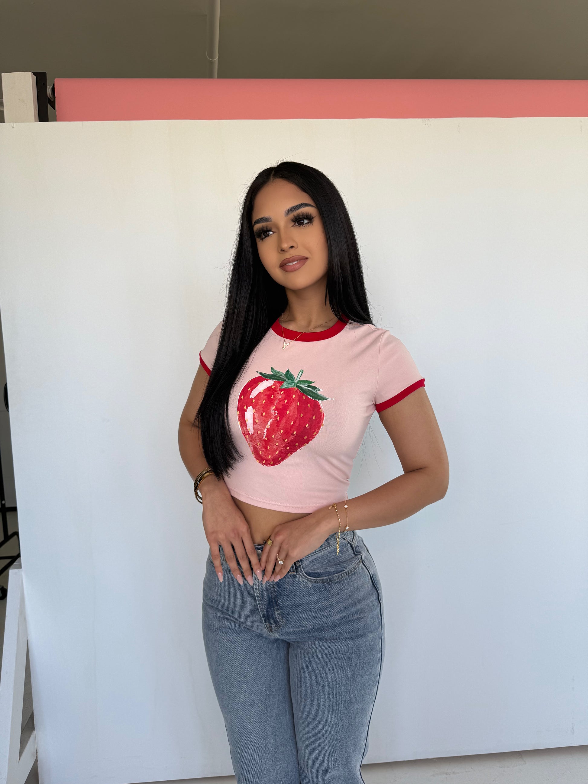 Sweet, playful, and effortlessly cute — our Fresita Top is a must-have for strawberry lovers. This soft pink fitted tee features a bold strawberry graphic on the front, red contrast trim, and a flattering cropped cut that pairs perfectly with your favorite denim, skirts, or cargos. Whether you’re dressing it up for a fun day out or keeping it casual, this top adds the perfect pop of fruity charm to any outfit.