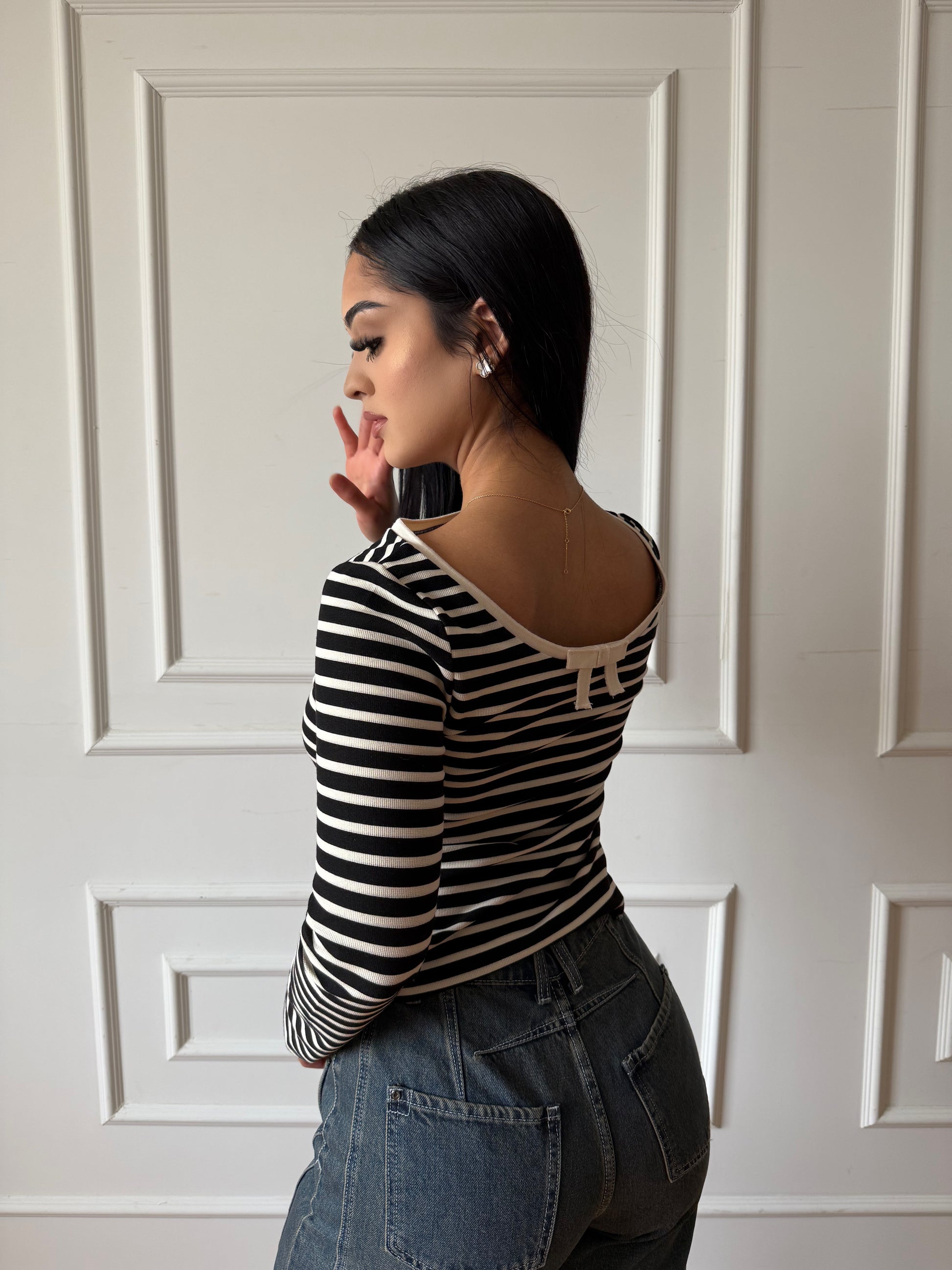 This Guel bow top features a low cut design and striped pattern with a front bow detail. The low cut enhances the neckline while the bow adds a touch of femininity. Perfect for a casual day out or a night on the town, this top will be a versatile addition to your wardrobe.