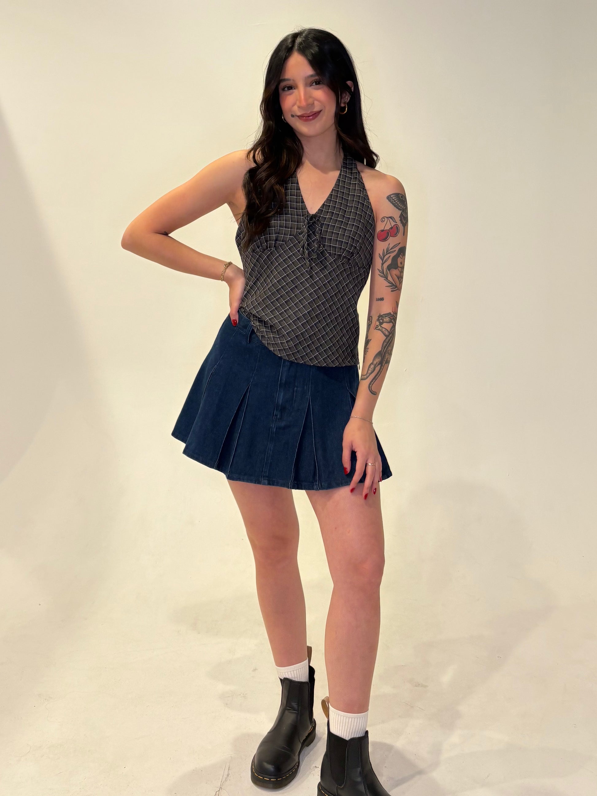 Flirty meets effortless in the Ivy Halter Neck Top. Designed in a dark plaid pattern, this top features a crisscross front detail and an open back that ties for an adjustable, flattering fit. The halter neckline adds a touch of edge while keeping things chic and feminine — perfect for a night out or a layered fall look.