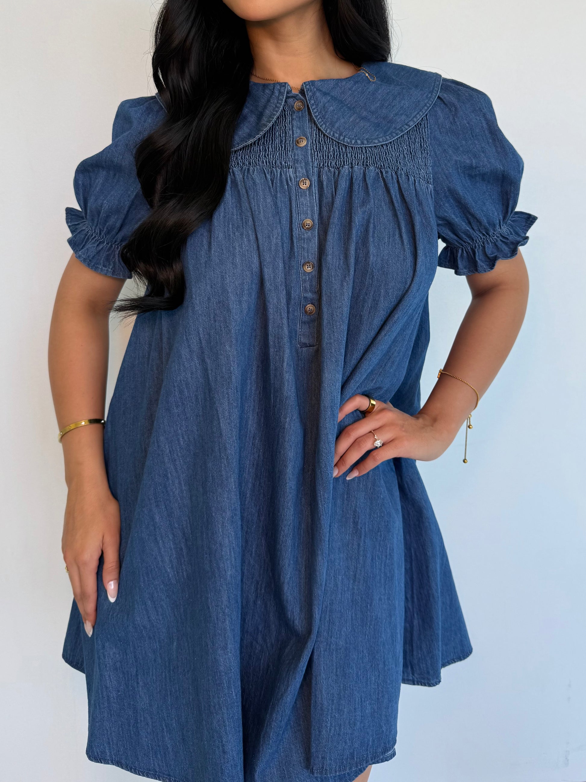 Chic, timeless, and a little romantic — the Live Without You Collar Dress is the perfect blend of classic and modern. This dark blue, denim-inspired dress features a sweet collared neckline, puff sleeves, and buttons down the front for that effortlessly put-together look. Falling right at the knee, it’s the kind of piece you can wear anywhere — from coffee dates to weekend strolls. Style it with your favorite gold jewelry and a cute bag for the ultimate everyday outfit.
