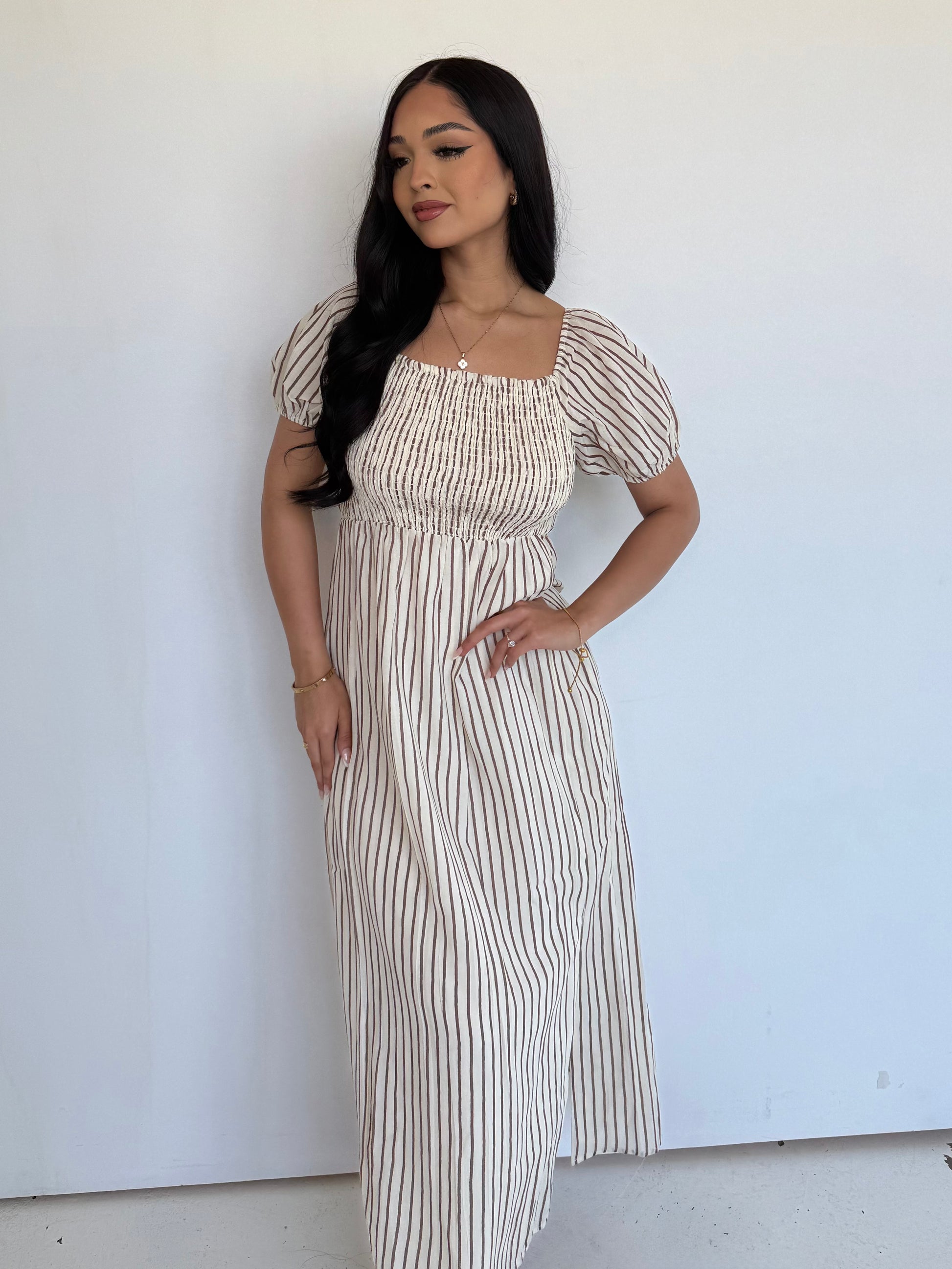 Step into effortless style with the Mocha Stripe Dress from Ozzirys. Crisp white with delicate brown stripes, puff sleeves, and an ankle-length silhouette with a subtle side slit, this dress is perfect for turning everyday moments into statement-making looks.