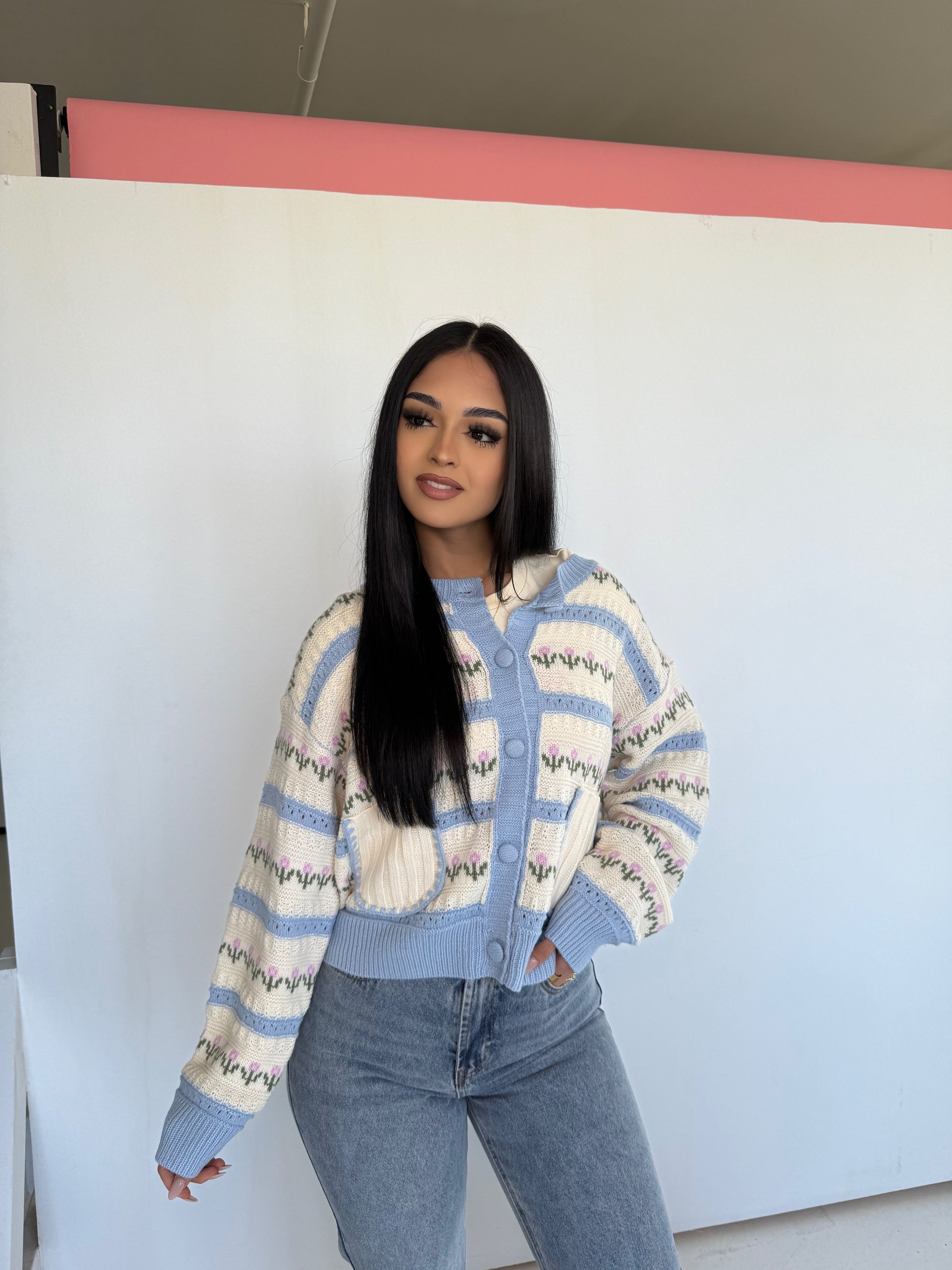 Cozy, chic, and perfect for the season — our Primaveral Knit Cardigan is the ultimate layering piece your closet needs. Crafted with a soft, breathable knit, it features a dreamy pastel palette and delicate floral-inspired patterns that give it a sweet, feminine feel. The relaxed fit and slightly cropped silhouette make it easy to style with your favorite jeans, skirts, or dresses, while the button-down front and front pockets add a touch of classic charm. Whether you’re going for a laid-back look or dressing it up, this cardigan will keep you warm and effortlessly stylish all day long.