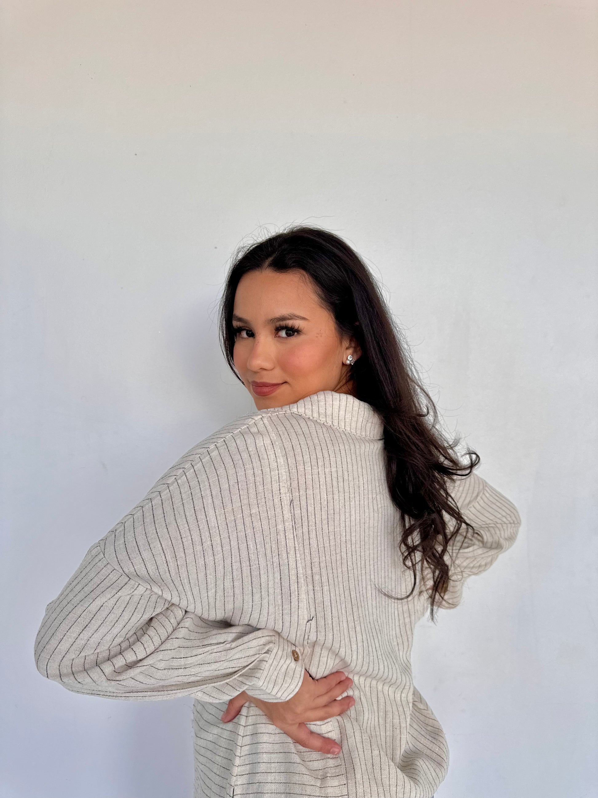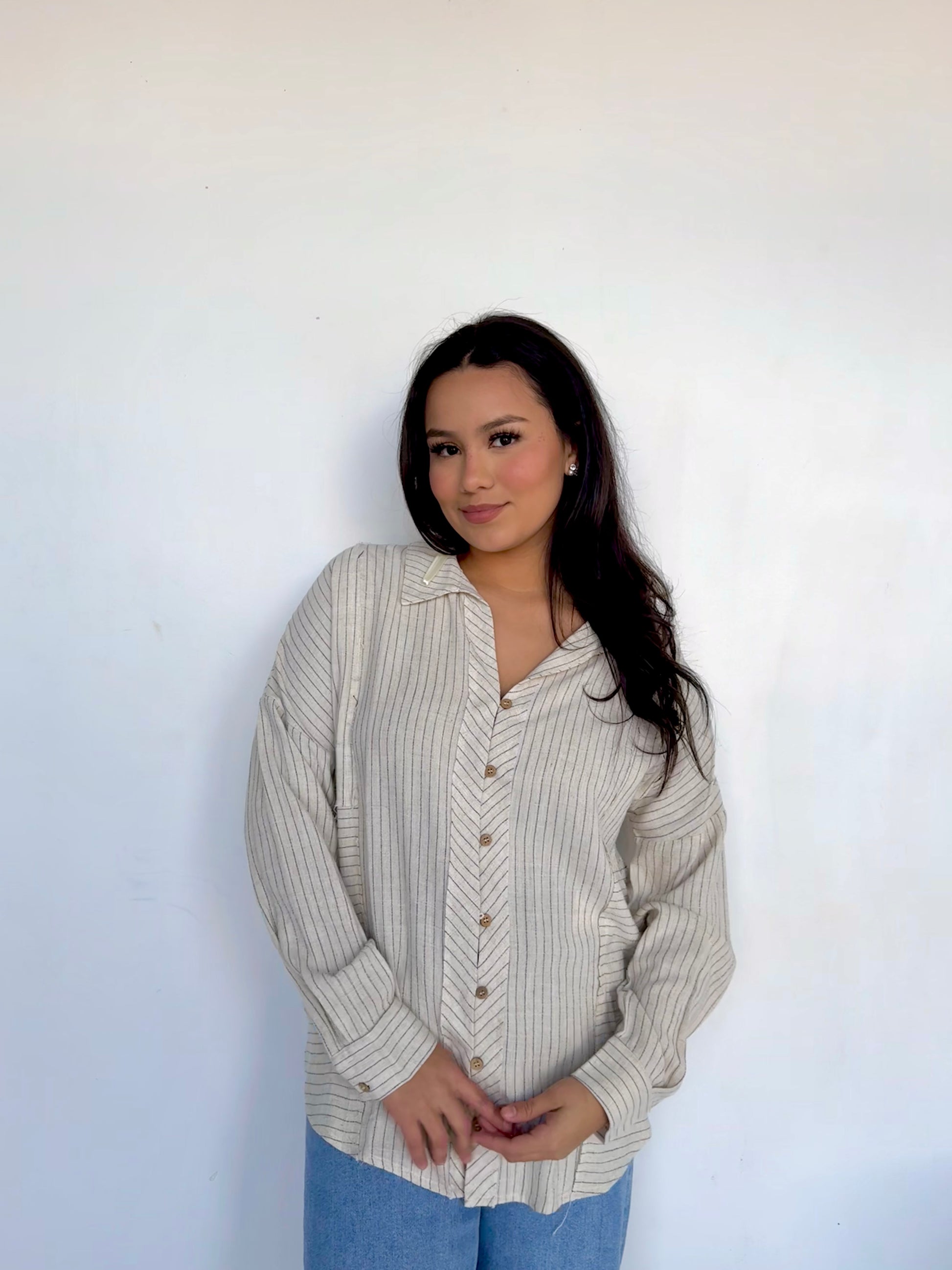 The Reese oatmeal top is the perfect addition to any wardrobe. Made with stripped linen, this button up top is not only versatile, but also timeless. It can be worn in any weather as a cover up or on its own. And with a true to size fit, you'll love how it looks and feels.