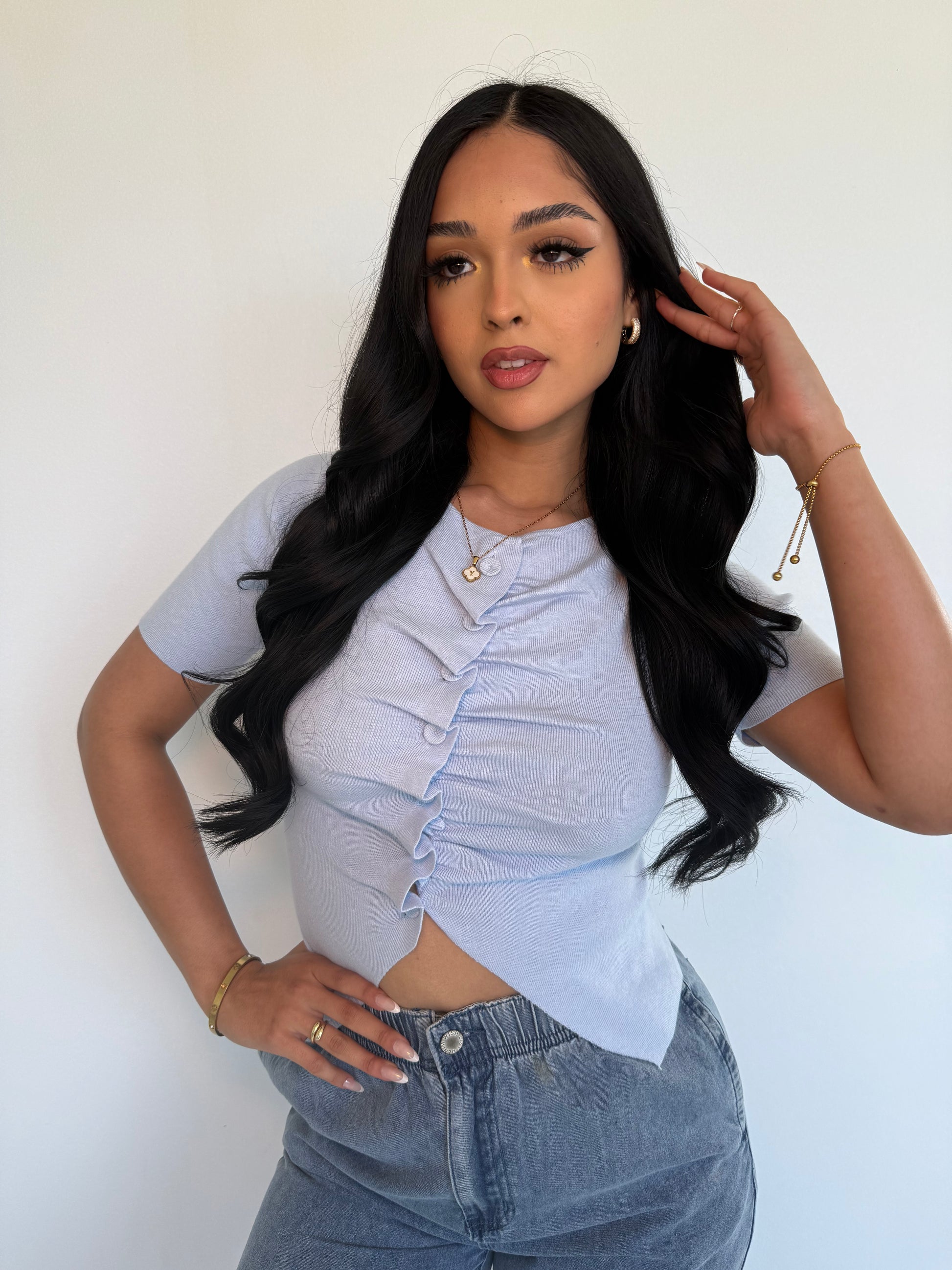 Soft, chic, and effortlessly cozy, the Sky Pleasted Sweater Top from Ozzirys is a wardrobe essential. This light blue button-down sweater pairs perfectly with jeans, skirts, or layered over dresses, bringing a touch of relaxed elegance to any outfit.