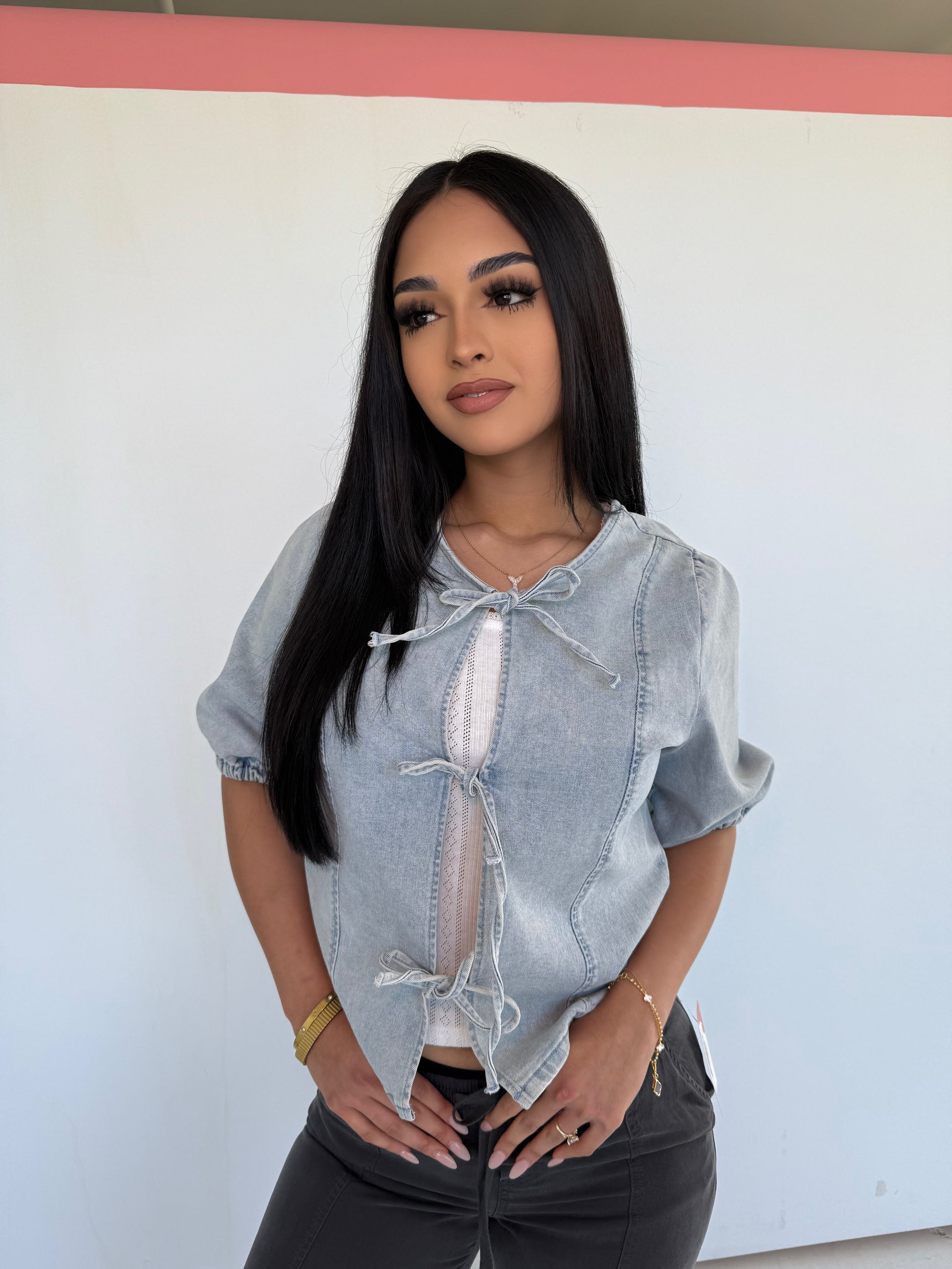 The Sofia bow denim top adds a touch of playfulness to any outfit with its charming bow detail. Made from high-quality denim, this top is durable and comfortable, making it a versatile and stylish addition to any wardrobe. Perfect for a casual day out or a dressier occasion.
